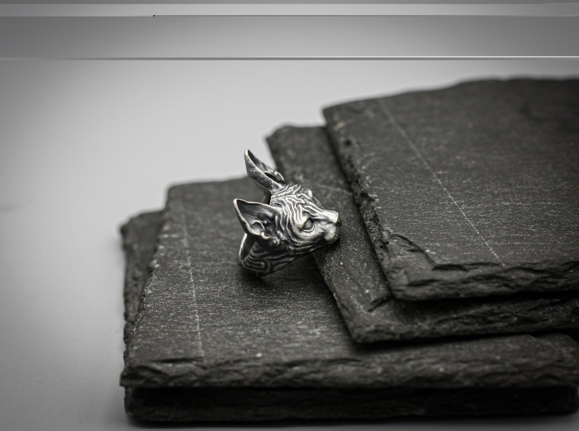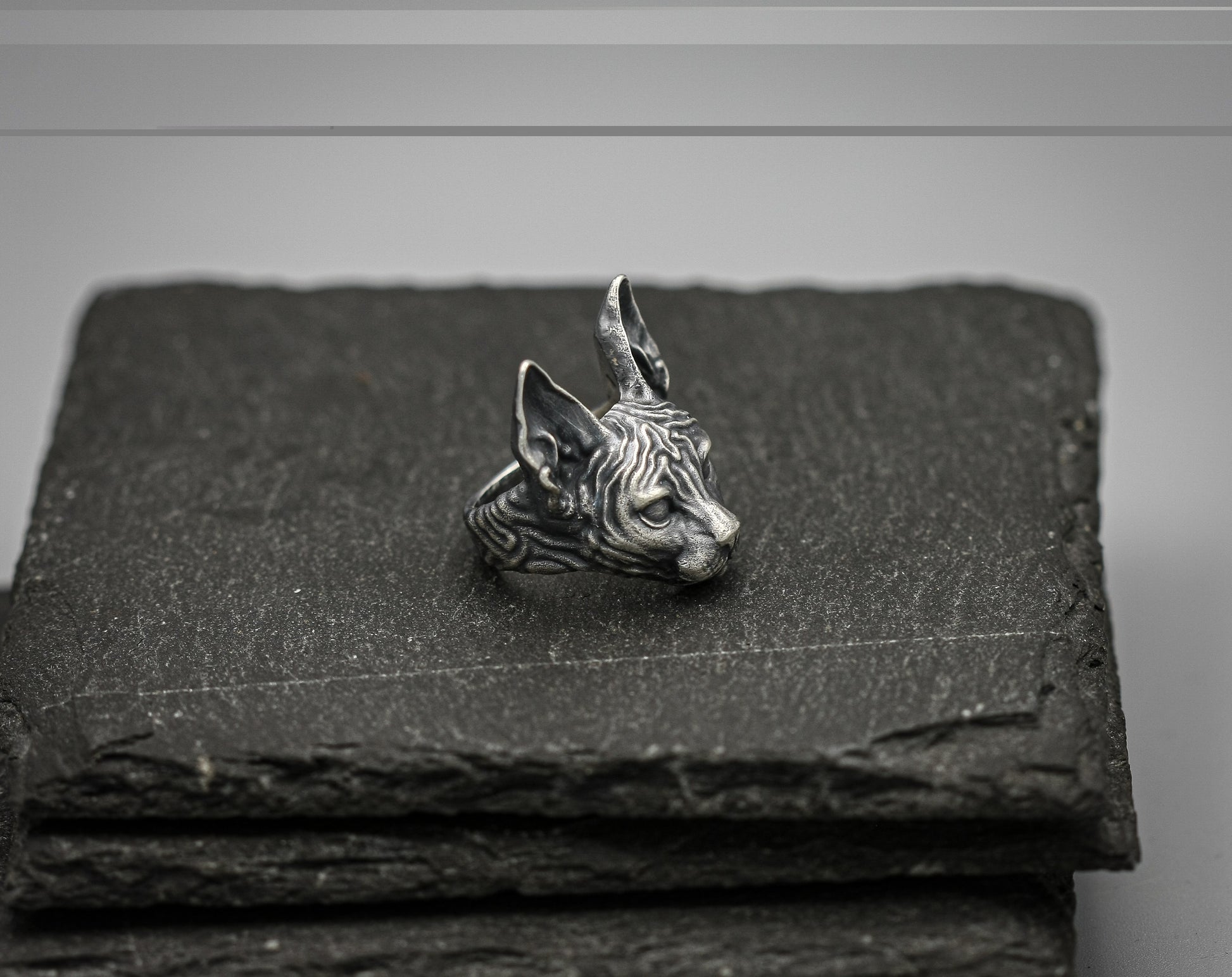 Unleash your inner mystique with this striking Sphynx cat ring, masterfully crafted in solid sterling silver. Inspired by the enigmatic beauty of the hairless Sphynx, this statement piece captures every intricate wrinkle and piercing gaze of the beloved feline.